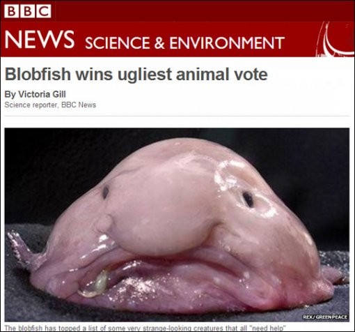 가장 못생긴 동물로 블롭피쉬(Blobfish)가 뽑혔다.영국 공영방송 BBC는 지난 12일(현지시각) 이색단체인 못생긴 동물 보호 협회(The Ugly Animal Preservation Society)는 세상에서 가장 못생긴 동물로 블롭피쉬를 선정했다고 전했다.