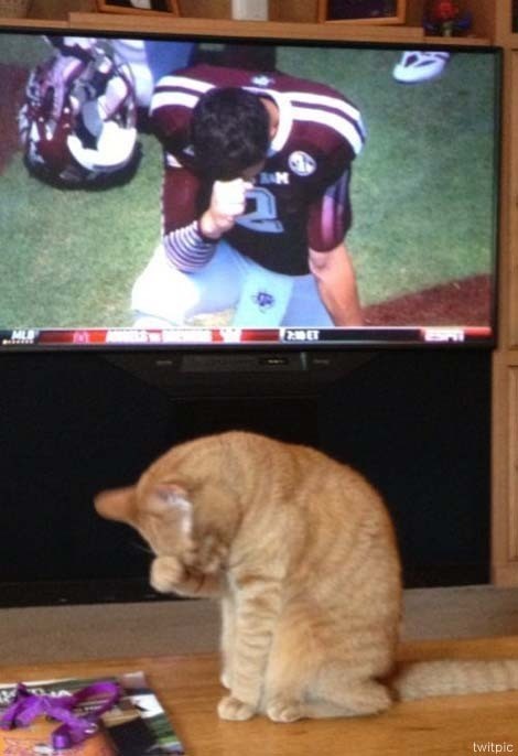 공개된 사진에는 TV 속 풋볼 선수의 포즈를 똑같이 따라하는 고양이의 모습이 담겨 있다. 무릎을 꿇은 채 한 손을 이마에 얹고 기도하는 듯한 자세가 웃음을 자아낸다.