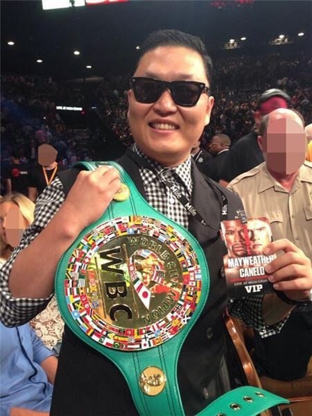 싸이는 선글라스를 쓴 채 VIP티켓을 들어 보이며 경기 관람을 인증했다. 사진 속 싸이는 복싱 WBC 웰터급 챔피언 벨트를 한쪽 어깨에 메고 환하게 웃고 있다.