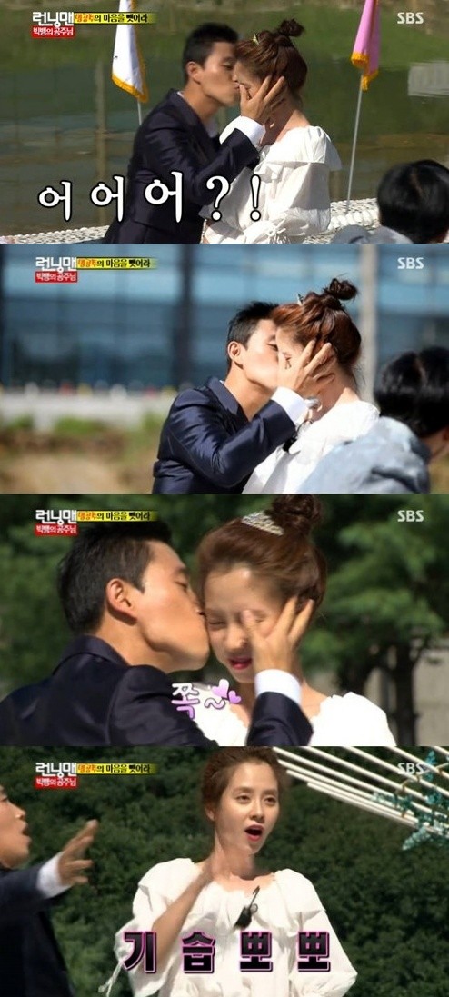 그러자 개리는 춤을 추다 송지효에게 다가가 얼굴을 잡더니 볼 쪽 소리가 날 정도로 기습 뽀뽀를 했다. 송지효는 “진짜 볼에 입술이 닿았다”고 볼을 붙잡으며 깜짝 놀란 표정을 지었고, 개리는 “저 말 시키지 말라”며 부끄러움을 감추지 못했다.