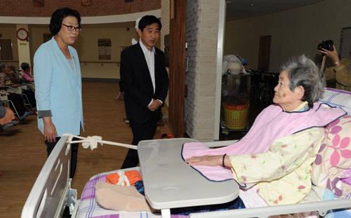 윤진숙 해양수산부장관이 16일 충남 공주시의 <공주산성시장>에서 시장상인 들을 만나 추석 물가 및 경기상황을 점검하고 애로사항을 청취했다. (사진 위) 윤장관은 이어 세종시 전의면에 위치한 <성요셉치매센터>를 찾아 어르신들을 위문하고, 전통시장에서 구입한 위문품과 위문금을 전달했다. (사진 아래)