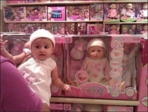공개된 사진에는 장난감 가게에서 핑크색 옷을 입은 아기가 엄마 품에 안긴 채 두 눈을 크게 뜨고 있다. 특히, 아기는 진열된 인형과 마치 도플갱어처럼 매우 닮아있어 놀라움을 자아낸다.