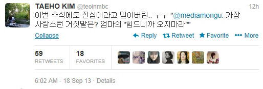 MBC <무한도전> 김태호 PD가 알면서도 속은 엄마의 거짓말에 공감했다.김태호PD는 19일 자신의 트위터에 “가장 사랑스런 거짓말은? 엄마의 ‘힘드니까 오지마라’”라는 지인의 글을 리트윗했다.