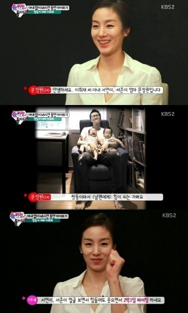 이날 이휘재는 본격적인 미션에 앞서 미모의 아내 문정원 씨가 깜짝 등장했다. 이휘재 아내는 “신랑이 요즘 쌍둥이 낳고 육아에 참여를 많이 한다”고 말했다. 이어 “늦게 아이를 봤더니 그게 너무 좋은가 보더라”라며 “쌍둥이라서 힘이 되는 가 보다”고 덧붙였다.
