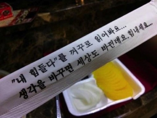 공개된 사진 속에는 보통 중국집에서 사용하는 나무 젓가락 모습이 담겨 있다. 그런데 젓가락 포장지 겉면에 “‘내 힘들다’를 거꾸로 읽어봐요. 생각을 바꾸면 세상도 바뀐대요. 힘내세요”라는 글귀가 적혀 있는 것.