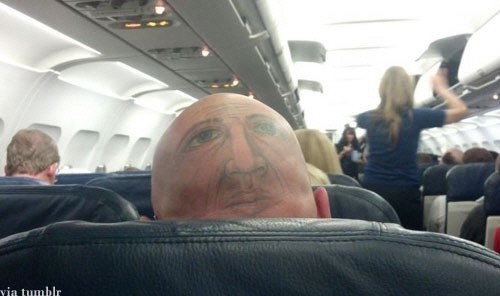 공개된 사진에는 비행기 앞좌석에 앉은 사람의 뒷통수를 촬영한 모습이 담겨 있다. 특히, 이 사람의 뒤통수에는 눈빛과 깊은 주름, 꽉 다문 입술 등 사람의 얼굴이 사실적으로 그려져 있어 눈길을 끈다.