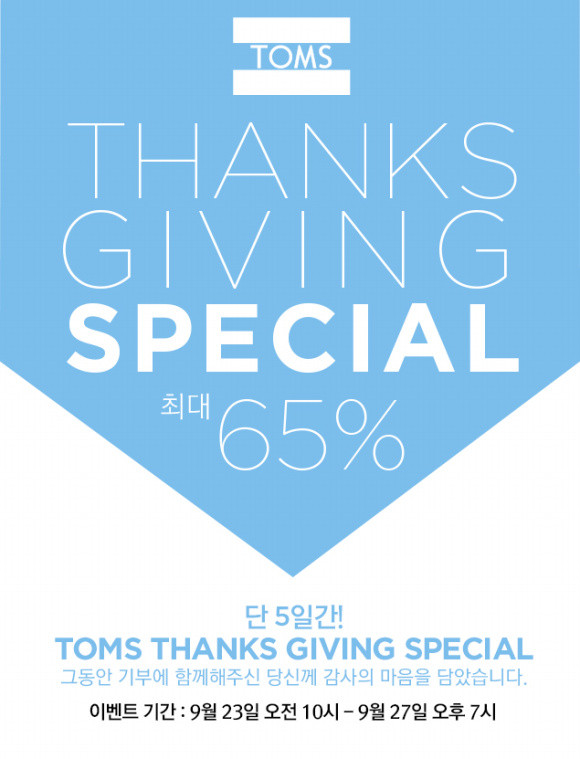 탐스(TOMS)가 [THANKS GIVING SPECIAL] 이벤트를 9월 23일 오전 10시부터 27일 오후 7시까지 5일간 진행한다.탐스는 고객이 신발 한 켤레를 구매 할 때마다 신발이 필요한 아이들에게 한 켤레를 전달하는 ONE FOR ONE 기부를 실천하고 있다. 이에 2006년 출시 이후 지난 7년간 전 세계의 신발이 없는 아이들에게 천만켤레의 신발을 기부했다.