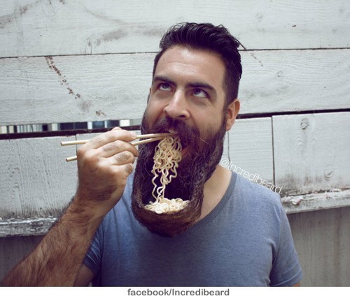 공개된 사진에는 한 남성이 길게 기른 턱수염을 그릇 모양으로 만든 뒤 라면을 담아 젓가락으로 면발을 집어 입에 쏙 넣는 모습이 담겨 있다. 이 남성은 라면 사발 외에도 컵 홀더로 활용하는 등 보는 이들에게 충격을 안겼다.