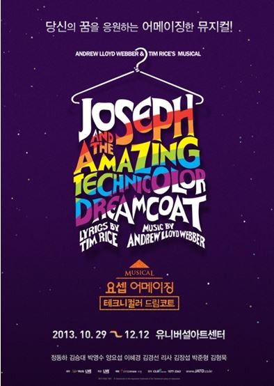 우리나라에서는 올해 2월 샤롯데 씨어터에서 정식 라이선스로는 처음 상연되었으며, 이번 앙코르 공연의 주인공 요셉 역에는 명품 보컬리스트 정동하, 뮤지컬계 명품 배우 김승대를 비롯해 떠오르는 떠오르는 뮤지벌 배우 박영수와 아이돌그룹 비스트 양요섭이 낙점 됐다.