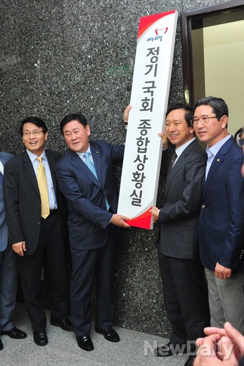 새누리당 <최경환> 원내대표 <김기현> 정책위의장 과 소속의원들이 26일 서울 여의도 국회 원내수석부대표실 앞에서 정기국회 종합상황실 현판식을 가지고 있다.