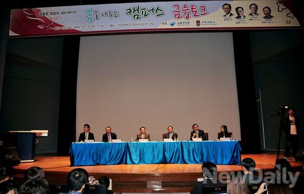 <꿈을 나누는 캠퍼스 금융토크>가 26일 오전 서울 서강대학교 성이냐시오관 강당에서 개최됐다. 이날 행사에는 400여명이 넘는 서강대 학생들이 강당을 가득 메운 가운데, 최수현 금융감독원장, 임창섭 하나대투증권 사장, LIG손해보험 사장, 박지우 KB국민은행 부행장이 참석해 최근 금융현안에 대해 열띤 토론을 벌였다.