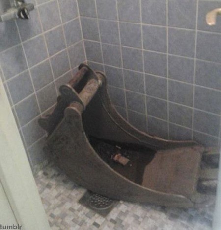 샤워실의 중장비 미스터리 사진이 공개됐다.최근 한 온라인 커뮤니티 게시판에는 [샤워실의 중장비 미스터리]라는 제목으로 한 장의 사진이 올라왔다.