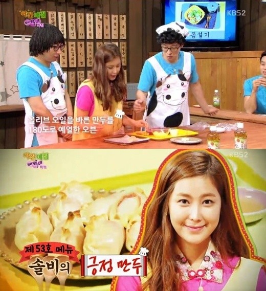 이날 솔비는 야간매점 코너에서 [긍정만두]를 선보였다. [긍정만두]는 시중에 판매하는 만두피 속에 가래떡, 베이컨, 치즈를 넣은 후 완성된 만두에 올리브 오일을 바르고 180도로 예열한 오븐에 15분간 구워내면 된다.