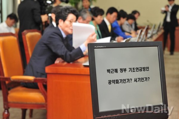 기초연금과 관련 야당 단독 소집요구로 27일 오전 여의도 국회에서 열린 [보건복지위원회 전체회의]가 새누리당이 불참한 가운데 야당의원들이 의사진행 발언을 하고 있다.