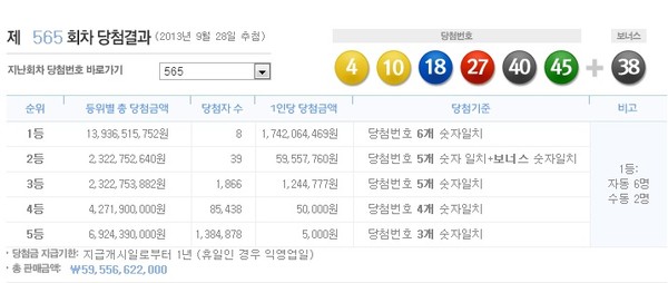 2013년 9월 28일 실시된 제565회 나눔로또 1등 당첨번호는 ‘4, 10, 18, 27, 40, 45’이며, 2등 보너스 번호는 38번이다.