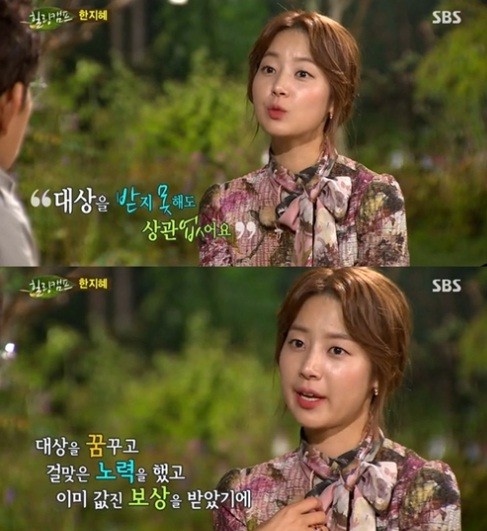 이날 한지혜는 “대상을 예감하느냐”는 MC 이경규의 질문에 “처음으로 드라마를 찍으면서 대상이라는 걸 생각해 봤다. 대상은 얼굴이 예쁘고 인기 많다고 해서 받는 건 아니다. 현장에서의 행동이 중요하다고 생각한다”고 운을 뗐다.