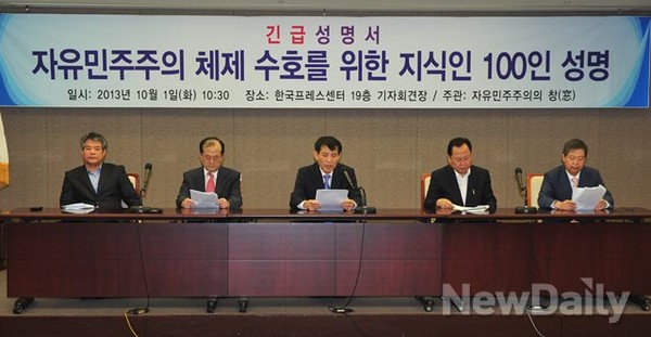 조영기(고려대 교수), 강정모(경희대 교수), 김석우(21세기국가발전연구원 원장/前통일부 차관), 남근우(한양대 교수), 이용환(한국선진화재단 정책연구원장), 이윤걸(북한정보전략센터 대표), 송대성(세종연구소 소장), 손기섭(부산외대 교수), 김정수(자유교육연합 대표), 김규호(선민네트워크 목사), 박상봉(前통일교육원 원장), 강규형(명지대 교수), 김태우(동국대 교수), 오경섭(세종연구소), 전우현(한양대 교수), 박휘락(국민대 교수), 문순보(세종연구소), 한정희(대구대 교수), 이주천(원광대 교수), 박성현(뉴데일리 주필), 배진영(인제대 교수), 조영일(연세대 명예교수), 이덕기(사단법인 충호안보연합 연구소장), 이경수(글로벌리더십연구소장), 김기호(녹색성장전국연합 본부장), 조광래(중부대 교수), 최승노(자유경제원 사무총장), 권혁철(자유경제원 실장), 김민기(자유경제원 실장), 곽은경(프리덤월드 기자), 김인영(한림대 교수), 박경귀(한국정책평가연구원 원장), 박진언(배재대 교수), 남동환(큐즈과학아카데미 이사장), 이 헌(변호사), 조형곤(21세기 미래교육연합 대표), 강철민(남북대학생 총연합 대표), 김기수(변호사), 이명희(공주대 교수), 강재천(민주화보상법개정운동본부 본부장), 강태규(한국외대), 최공재(한국다양성영화발전협의회 대표), 박근태(한국다양성영화발전협의회 사무장), 장창원(前직업능력개발원), 신도철(숙명여대 교수), 김지영(한국외대), 손용우(한남대 겸임교수), 최인식(한국시민단체협의회 집행위원장), 이철수(한북대 교수), 주재우(경희대 교수), 선상신(대구대 교수), 윤문원(작가), 고영주(국가정상화추진위원회 위원장), 민경국(강원대 교수), 유광호(한국전략문제연구소 소장), 양동안(한국학중앙연구원 명예교수), 최대권, 김혁수(예비역 제독), 황성돈(한국외대 교수), 김원식(건국대 교수), 조희문(인하대 교수), 이춘근(한국해양전략연구소), 현진권(한국경제연구원 소장), 박광작(성균관대 명예교수), 김광동(나라정책원 원장), 이동호(북한민주화포럼 간사), 강석승(서울교대 교수), 황윤원(중앙대 교수), 김진술(북&피플 대표), 이주영(건국대 前부총장), 박기영(전북대 명예교수), 김효선(건국이념보급회 사무총장), 한종수(단국대 교수), 이재석(인천대 교수), 임상철(상지대 교수), 정상화(세종연구소), 김이석(시장경제제도연구소), 김태훈(변호사), 조휘제(북한민주화위원회), 천세영(충남대 교수), 김종석(홍익대 교수), 정경희(아산정책연구원 초빙연구위원), 왕해숙(연세대 연구교수), 송봉선(고려대 겸임교수), 정영순(한국학중앙연구원 교수), 김기숙(대한민국 플러스연합 대표), 이갑산(범시민사회단체연합 대표), 이동수(민주평통 위원), 김진성(공교육살리기 국민연합 대표), 남정욱(숭실대 교수), 안찬일(중앙대 교수), 이윤구(자유교원조합 중앙위원장), 최창규(명지대 교수), 박명수(서울신학대 교수), 주익종(낙성대연구소), 권희영(한국학중앙연구원 교수), 조한석(시인) 이상 101명 서명