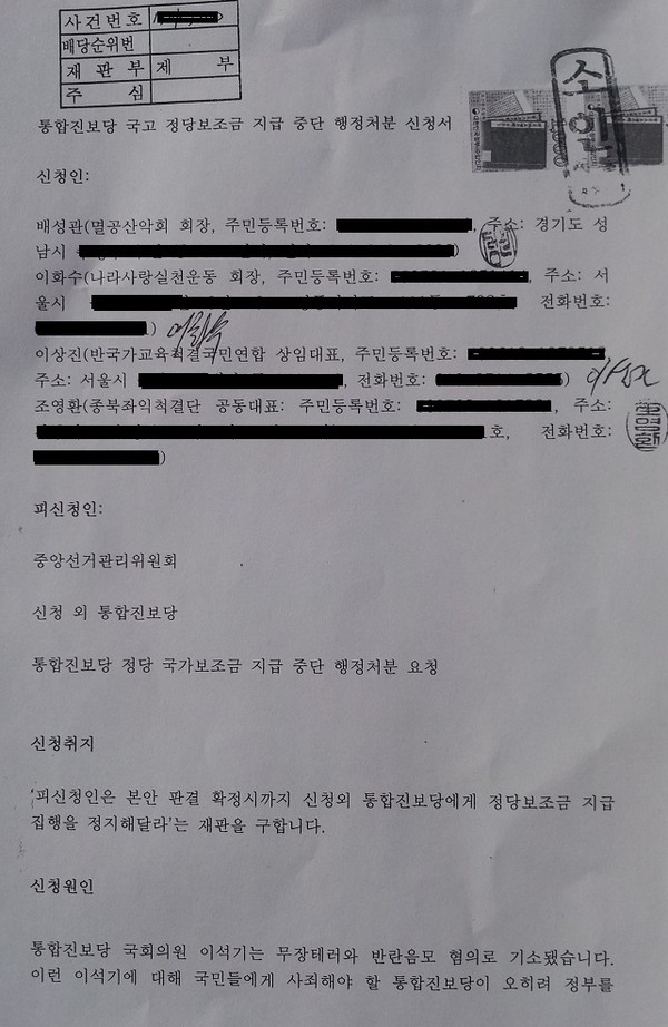 배성관(멸공산악회 회장), 이화수(나라사랑실천운동 회장), 이상진(반국가교육척결국민연합 상임대표) 그리고 조영환(종북좌익척결단 공동대표)가 30일 서울행정법원에 ‘중앙선거관리위원회(소외 통합진보당)’를 상대로 “통합진보당 국회의원 이석기는 무장테러와 반란음모 혐의로 기소됐다”며 “넘치는 자유와 민주를 악용하여, 국민들이 피땀 흘려서 이룩한 자유민주주의를 훼손하고 위헌적인 행태를 보여주는 통합진보당에게 국가의 정당보조금을 주는 것은 국민의 혈세를 낭비하고, 국가의 법치를 파괴하고, 국가의 안보를 약화시키는 행정이기 때문에, 통합진보당에 대한 국가의 정당보조금을 지불하지 말기 바란다”는 취지의 ‘통합진보당 정당보조금 지급 중단 청구소송’을 냈다. 국민의 혈세로 위헌적 행동을 하는 좌익정당을 폐쇄하라는 국민의 요구다.이들은 “재량권일탈 남용을 인정 행정처분을 취소한 피보전권리에 관해 대법원은 행정처분의 재량권일탈과 재량권남용에 관하여 신중한 태도를 취하고 있지만, 재량권 일탈과 재량권남용을 인정하여 행정처분을 취소한 사례도 많다”며 “대법원은 1958.12.20.선고 4291행항6 판결에서 재량권 남용을, 1969.7.22.선고 69누38판결에서는 재량권 일탈을, 1977.9.13.선고 77누15판결에서는 비례의 원칙을 위반하는 재량권 일탈 남용을, 1983.12.27.선고 81누366판결, 1991.12.10.선고 90누7609판결, 1997.4.11.선고 96누17325판결에서도 재량권 일탈을, 1994,1.25.선고 93누13537판결, 1997.7.22.선고 97다3200판결에서는 재량권 일탈과 남용을, 서울행정법원은 2013.5.24.선고 2012구합44126판결에서 재량권 일탈과 남용을 각 인정하여 행정처분을 취소하였다”는 판례를 들었다.