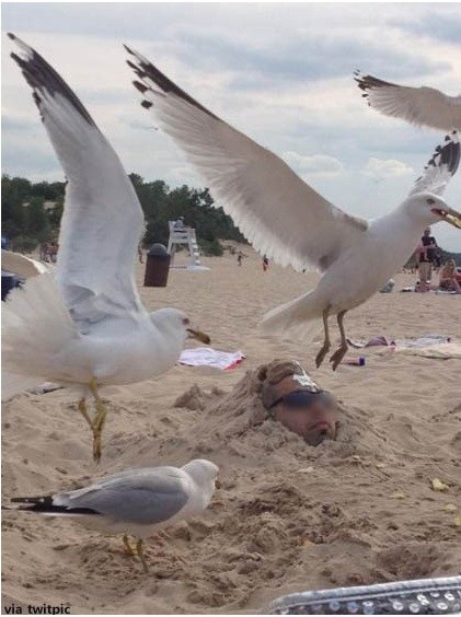 공개된 사진에는 모래 찜질을 즐기고 있는 한 남성의 모습이 담겨 있다. 그런데 사진을 자세히 보면 남자 주변에 갑자기 갈매기 떼들이 모여들었고, 그 중 한 마리가 이 남성의 얼굴에 배설물을 투하했다.