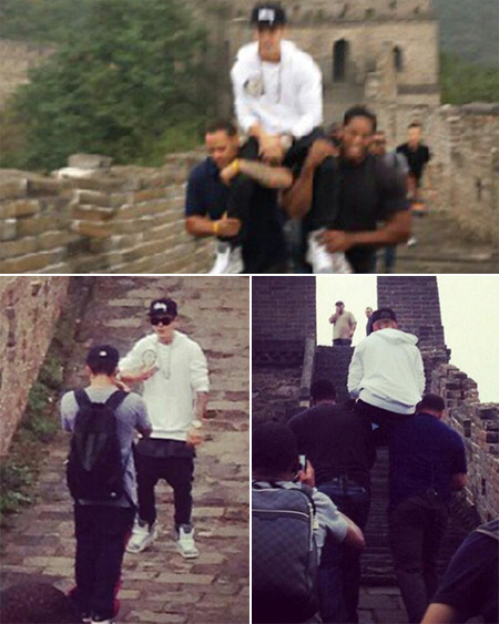 공개된 사진 속 저스틴 비버는 두 명의 경호원 어깨 위에 올라탄 채 편안하게 만리장성을 오르고 있으며, 이에 반해 몹시 힘들어하는 경호원들의 모습이 대조적이다.