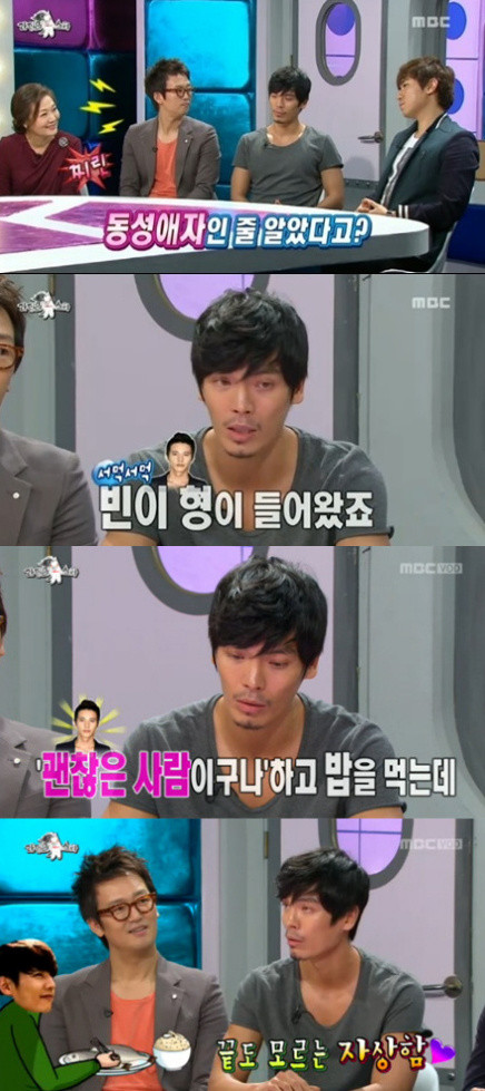 이날 MC들은 원빈과 영화 <아저씨>에 함께 출연한 김성오에게 “처음에 원빈이 동성애자로 오인했다고 하던데…”라고 물었다.