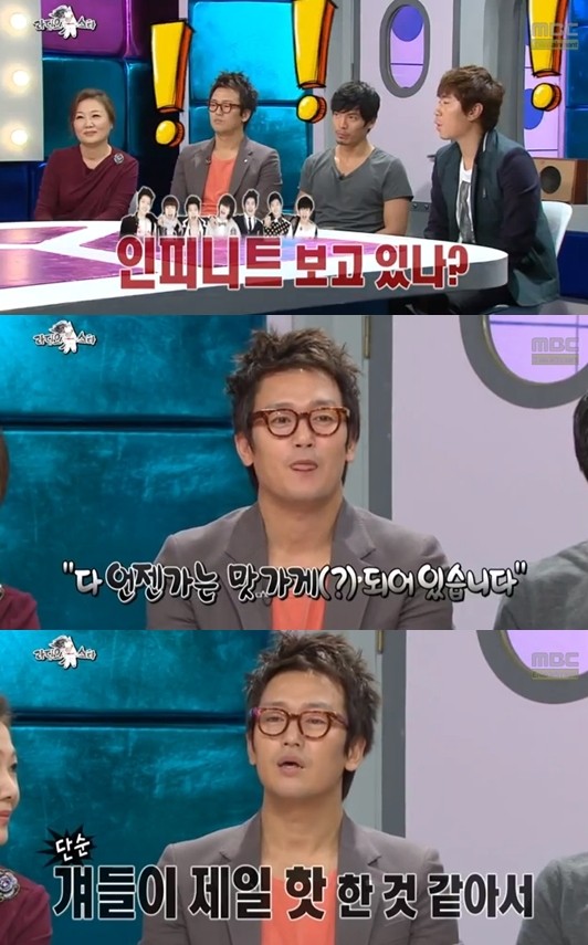 김정태가 인피니트를 디스에 대해 해명했다.지난 2일 방송된 MBC <황금어장-라디오스타>에는 [깡] 특집으로 배우 김해숙, 김정태, 김성오, 이시언이 출연해 재치 있는 입담을 펼쳤다.