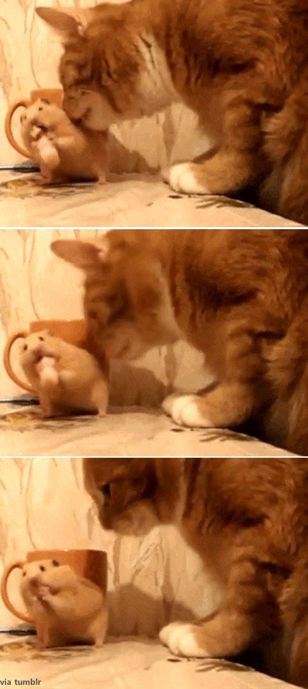 하지만 쥐는 고양이의 위협적인 행동에서 아랑곳 하지 않고 계속 먹는 것에 집중하며, 급기야 먹던 것을 뺏길까봐 재빨리 입에 넣고 사라져 웃음을 자아낸다.