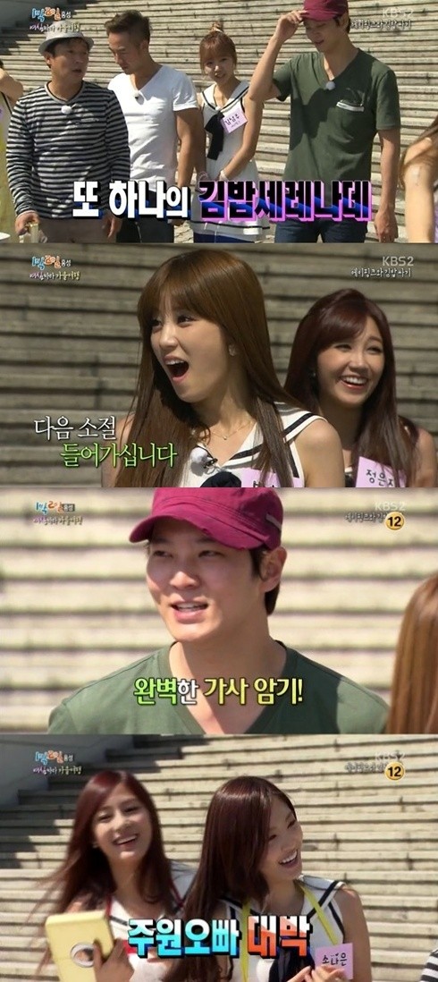 이날 본격적인 여행에 앞서 멤버들은 KBS 방송사 앞에 모여 함께 여행을 떠나고 싶은 여성들을 꼽았다. 평소 에이핑크를 좋아하던 주원은 망설임 없이 에이핑크를 꼽았고, 실제로 에이핑크가 등장하자 그는 얼굴까지 빨개지며 기쁨을 감추지 못했다.