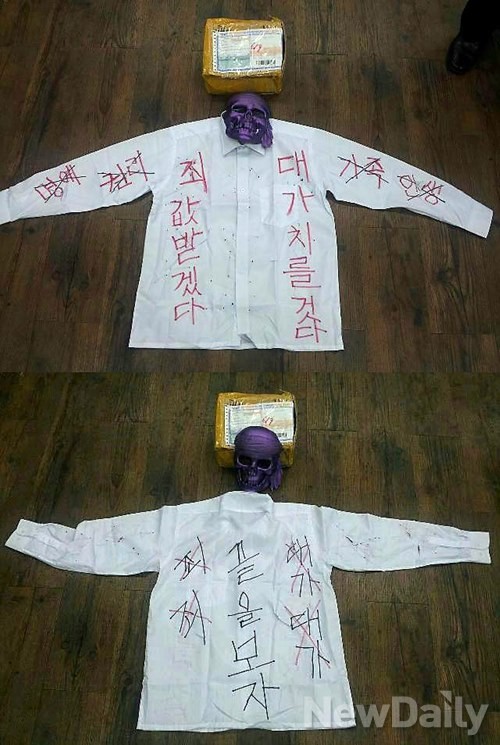흰색 와이셔츠 앞면에<대가를 치를 것다, 죄값 받겠다>라고 적혀 있으며 뒷면에는 <끝을 보자>라는 글이 적혀있다.