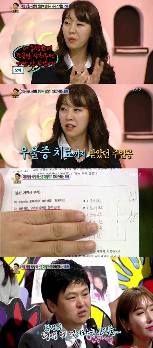 이 뿐만 아니라 남자친구와 송씨, 동생바보 오빠가 작성한 혼전 계약서도 이날 공개돼 놀라움을 자아냈다. 계약서에는 [쫑쫑이는 오빠 거다. 결혼해도 영원히], [결혼하면 당연히 오빠도 함께 산다], [오빠는 언제든지 쫑쫑이를 데리고 놀러갈 수 있다] 등의 내용이 적혀 있었다.