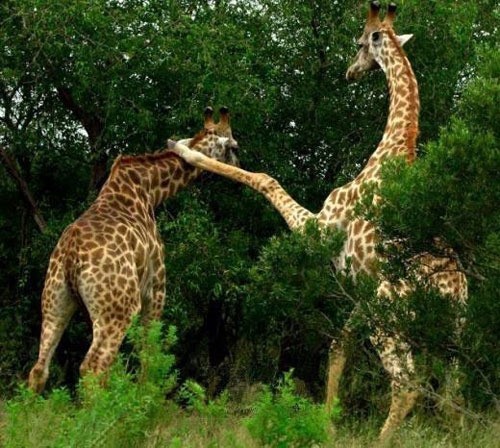 두 기린은 먹이 쟁탈과 짝짓기를 위해 동족끼리 싸움을 벌이는 것으로 알려졌다. 게시자는 “영국 사진작가 벤 콜레이가 남아프리카에서 포착한 사진이다. 두 기린은 수차례 수비와 동시에 공격을 가하며 싸움을 벌이던 중 한 마리가 일시 후퇴하면서 일단락 됐다”라고 설명했다.