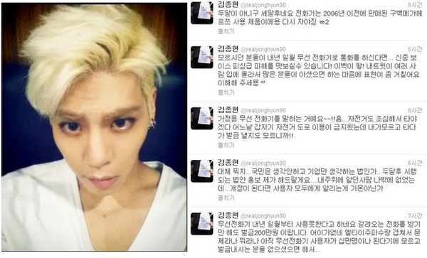 KT는 다른 이통사보다 LTE-A를 늦게 시작해야 했다.이에 종현은 12일 자신의 트위터에“내년 1월부터 무선전화기를 사용 못 한다고 하네요.전화를 받기만 해도 벌금 200만 원이랍니다. 어이가 없네”라고 글을 올렸다."LTE 주파수와 겹쳐서 문제라나 뭐라나.아직 무선전화기 사용자가 10만명이나 된다기에모르고 벌금내시는 분들 없으셨으면 해서..."이어 "대체 뭐지...국민은 생각 안 하고 기업만 생각하는 법인가...두달 후 시행되는 법안 홍보 제가 해드릴게요....내 주위에 알던 사람 나밖에 없었는데...개정이 된다면 사용자 모두에게 알리는게 기본아닌가"라며미래부의 무선전화기 사용 금지 정책을 지적했다.또한 “자전거도 조심해서 타야겠다.어느 날 갑자기 자전거 도로 이용이 금지됐는데내가 모르고 타다가 벌금 낼지도 모르니까”라며 비판했다."모르시던 분들이내년 1월 무선 전화기로 통화를 하신다면...신종 보이스 피싱급 피해를 맛보실수 있습니다!내 트윗이 여러 사람 입에 올라서많은 분들이 아셨으면 하는 마음에표현이 좀 거칠어요 이해해 주세요."[사진 = 종현 트위터, 무선전화기 사용금지]