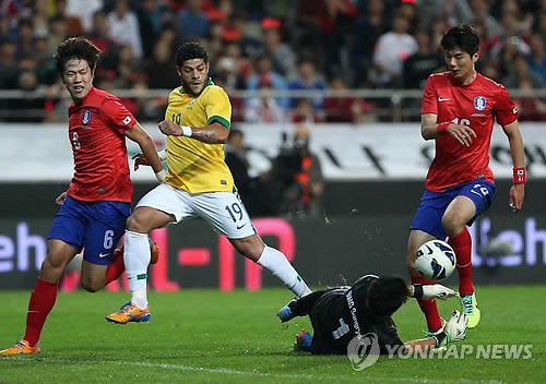 축구 국가대표팀 평가전에서홍명보 호가 삼바축구 브라질에 결국 패배했다.홍명보 감독의 국가대표팀은 12일 오후 8시서울 월드컵경기장에서 열린브라질과의 평가전에서네이마르(바르셀로나)와 오스카(첼시)에게 골을 허락하며0 : 2로 패했다.대한민국 축구 대표팀은 전반전,브라질을 압박하며 경기를 진행했지만전반 44분 <네이마르>의 프리킥에 선제골을 허용했다.이어 후반 4분경<오스카>가 추가 골을 득점해2점을 내주고 말았다.대한민국은 전반 2분경기성용이 중거리 슛을 쏘며분위기를 이끌었지만브라질의 높은 볼 점유율을 저지할 수는 없었다.하지만 전반전 중반 무렵부터는적극적인 기세로 브라질을 따라잡았다.전반 33분쯤에는김보경이 페널티 박스 정면에서 기회를 잡아오른발 슛을 쐈지만 골키퍼에게 잡히고 말았다.결국 전반 44분 <네이마르>에게 골을 허락했다.전반전에서는 브라질이 골 점유율 69%로흐름을 이끌었다.대한민국은 후반 시작과 함께적극적으로 공격하며 브라질을 압박하는듯 했으나<오스카>에게 2번째 골을 허락하고 말았다.이후 홍명보 감독은 <구자철>을 <손흥민>으로,<김보경>을 <고요한>으로 교체했다.후반전 경기 중반 이청용의 헤딩슛이성공하는듯 했지만 골문을 살짝 비껴갔다.결국 대한민국은 브라질에 2골을 내어주며 패배했다.한편, 서울 월드컵경기장에는국제 축구연맹 랭킹 8위의 브라질과 대한민국의국가대표팀 평가전을 보기 위해6만 5,000여명의 관중이 모였다.이는 지난 2002년 한일 월드컵 준결승전인한국vs독일 경기 관중인 6만 5,256명을 넘는서울 월드컵경기장 역대 최대 관중 기록이다.홍명보 호는 오는 15일 오후 8시 천안종합운동장에서아프리카를 상대로 경기를 가질 예정이다.