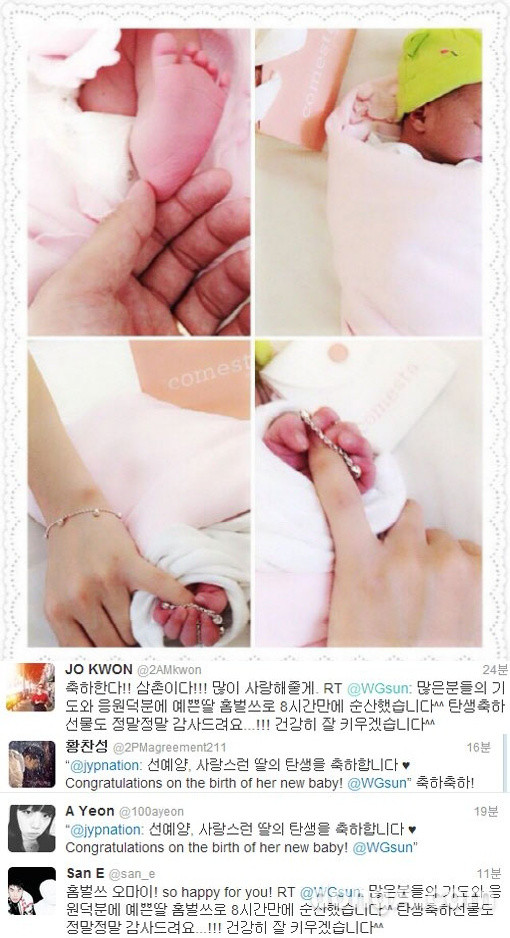 이에 JYP엔터테인먼트 공식트위터에는 “선예양, 사랑스러운 딸의 탄생을 축하합니다♥(Congratulations on the birth of her new baby!)”라는 글로 선예의 득녀를 축하했다.
