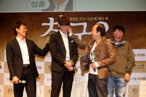 배우 김광규가 <친구2> 제작보고회에 깜짝 등장했다.10월 17일 서울 롯데시네마 건대입구에서 열린 영화 <친구2> 제작보고회에는 곽경택 감독을 비롯해 배우 유오성, 김우빈이 참석했다.