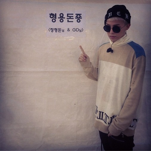 공개된 사진 속 지드래곤은 선글라스에 비니를 착용한 채 팀명인 [형용돈죵](정형돈, 지드래곤)이라고 쓰인 글귀를 가리키며 포즈를 취하고 있다.