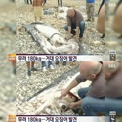 180kg 괴물 오징어는 [대왕오징어](Architeuthis dux)에 속하는 종으로 길이가 9m, 무게가 180kg에 달하며, 이 오징어는 지역 박물관으로 옮겨진 것으로 알려졌다. 특히, 눈이 일반사람의 머리 크기만해 놀라움을 자아낸다.