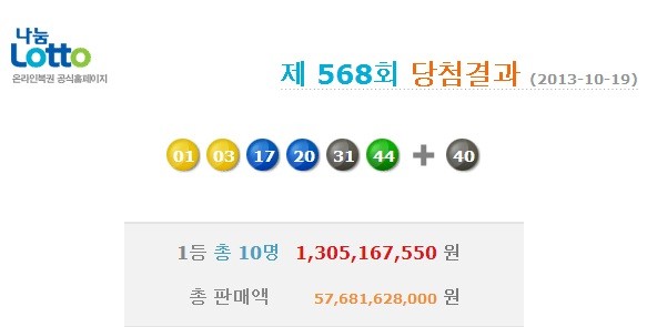 2013년 10월 19일 실시된 제568회 나눔로또 1등 당첨번호는 ‘1, 3, 17, 20, 31, 44’이며, 2등 보너스 번호는 40번이다.