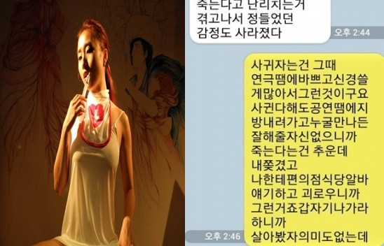 연극배우 이유린이 자신이 출연하는 성인연극이 홍보논란에 휩싸이자 자신을 매춘부 취급했던 전 남자친구에게 공개 메시지를 보냈다.이유린은 21일 자신의 블로그에 전 남자친구에게 받은 과거 모바일 메시저 대화 내용을 캡처한 사진과 함께 글을 게재했다.