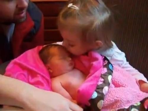 공개된 사진에는 분홍색 포대기에 쌓여 있는 아기의 이마에 입을 맞추고 있는 여자아이의 모습이 담겨 있다. 특히, 여자아이는 사랑스러운 눈빛으로 여동생을 바라보고 있어 보는 이들의 입가에 미소를 짓게 한다.