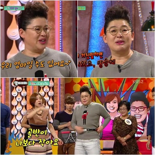 이영자가 웃기기 위해서라면 물 불 안 가리는 열정으로 시청자들의 뜨거운 호응을 받고 있다.지난 20일 방송된 KBS 2TV <해피선데이-맘마미아>에서는 [기혼연예인 특집]으로 배우 강성진을 비롯해 개그맨 문천식, 김원효, 한민관이 엄마와 함께 출연했다.