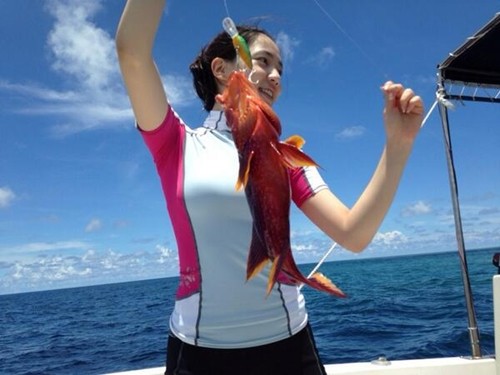 공개된 사진 속 화영은 푸른 바다를 배경으로 스킨스쿠버다이빙 수트를 입고 낚은 물고기를 들어올리며 환하게 웃고 있다.