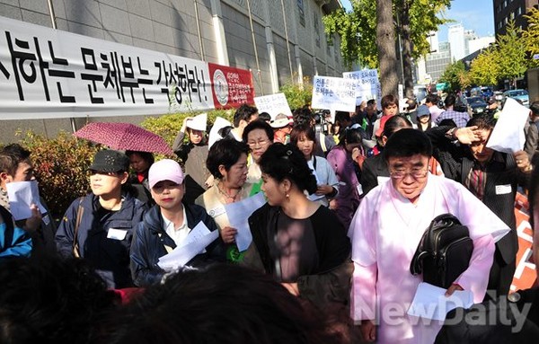 (사)중요무형문화재 기·예능 협회중요무형문화재 보유자 및 전수조교 300여명이<덕수궁 석조전 별관을 무형문화재들의전용 전시 및 공연장으로 사용>을 주장하며23일 오후 서울 종로구 문화체육관광부 정문 앞에서기자회견을 열고 문화체육관광부장관의 면담을 요청했다.