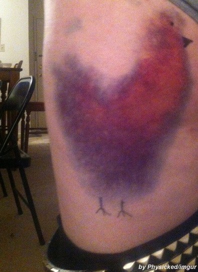 해당 게시물은 한 미국인 공개한 것으로 사진 속에는 멍이 든 팔꿈치에는 그림을 그려 닭을 완성시킨 모습이다. 게시자는 “친구가 넘어져 멍이들었는데 점과 직선을 몇 개 그렸더니 닭이 됐다”고 설명했다.