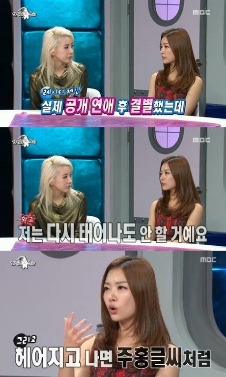 가수 레이디 제인이 다시는 공개연애를 하지 않겠다고 선언했다.지난 23일 방송된 MBC <황금어장-라디오스타>는 [여가수들의 은밀한 매력] 특집으로 박지윤, 서인영, 레이디 제인, 레이디스코드 권리세가 출연해 솔직한 입담을 뽐냈다.