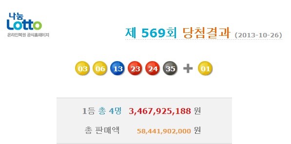 2013년 10월 26일 실시된 제569회 나눔로또 1등 당첨번호는 ‘3, 6, 13, 23, 24, 35’이며, 2등 보너스 번호는 1번이다.