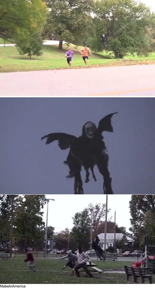 공개된 사진에는 검은 망토에 해골 얼굴, 박쥐의 날개를 가진 저승사자가 곳곳에 출현해 많은 사람들을 놀라게 하고 있다. 이 저승사자는 조깅을 즐기던 사람들, 농구하던 청소년, 놀이터에서 노는 아이들을 뒤쫓았다.