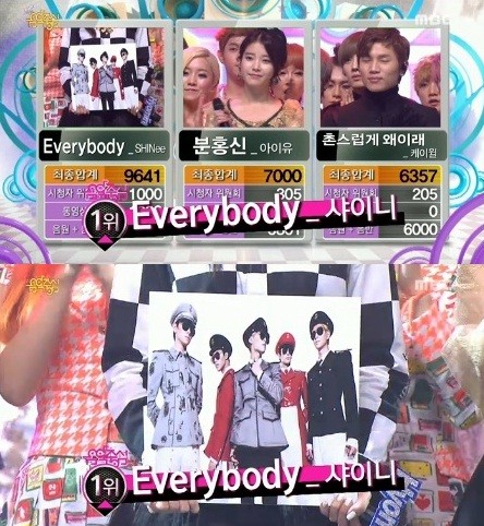 샤이니는 26일 오후 방송된 MBC <쇼! 음악중심>에서 미니앨범 5집 타이틀곡 [Everybody](에브리바디)로 케이윌 [촌스럽게 왜이래], 아이유 [분홍신]을 꺾고 1위 영예를 안았다.