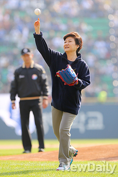 <한국시리즈 3차전 경기>에서 시구를 선보였다.박 대통령의 이날 시구는