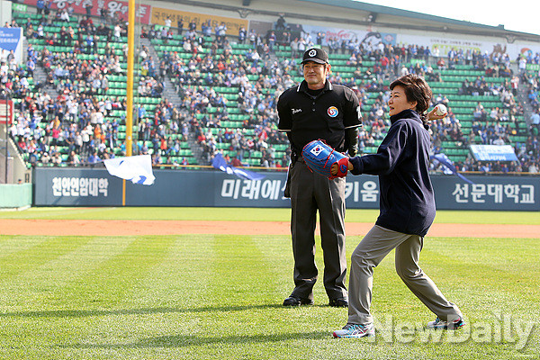 두산과 삼성의 코리안 시리즈 3차전에 앞서 시구를 하고 있다.